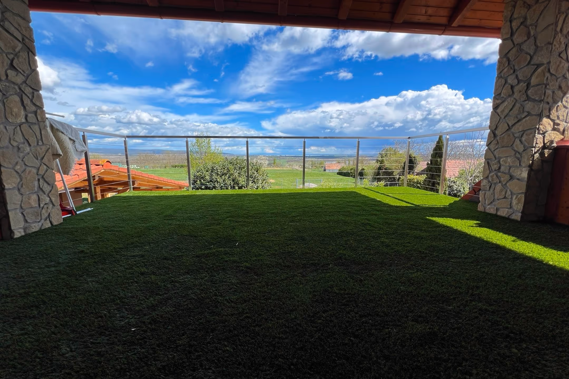 Nem túl sűrű, mégis természetes megjelenésű pázsit, amely a nyaralók otthonos kertjének barátságos hangulatát idézi.